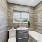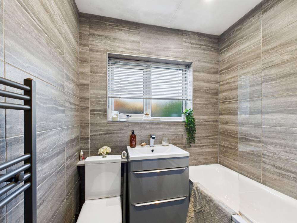 Modern white suite comprising low flush w.c, wash hand basin with chrome mixer tap set into storage unit. White paneled bath with shower over. Fully tiled walls. Modern central heating towel radiator and Upvc, frosted double glazed window to the rear.