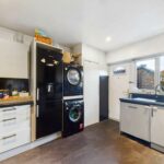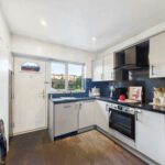 Modern kitchen fitted with a range of grey high gloss units to both high and low levels. Complimentary worktop with splashback and inset sink, drainer and mixer tap. Four ring electric hob with electric oven below and extractor hood above. Plumbing for automatic washing machine and space for under counter fridge and freeze. Door leading to rear garden and door to pantry storage. Upvc double glazed window overlooking rear.
