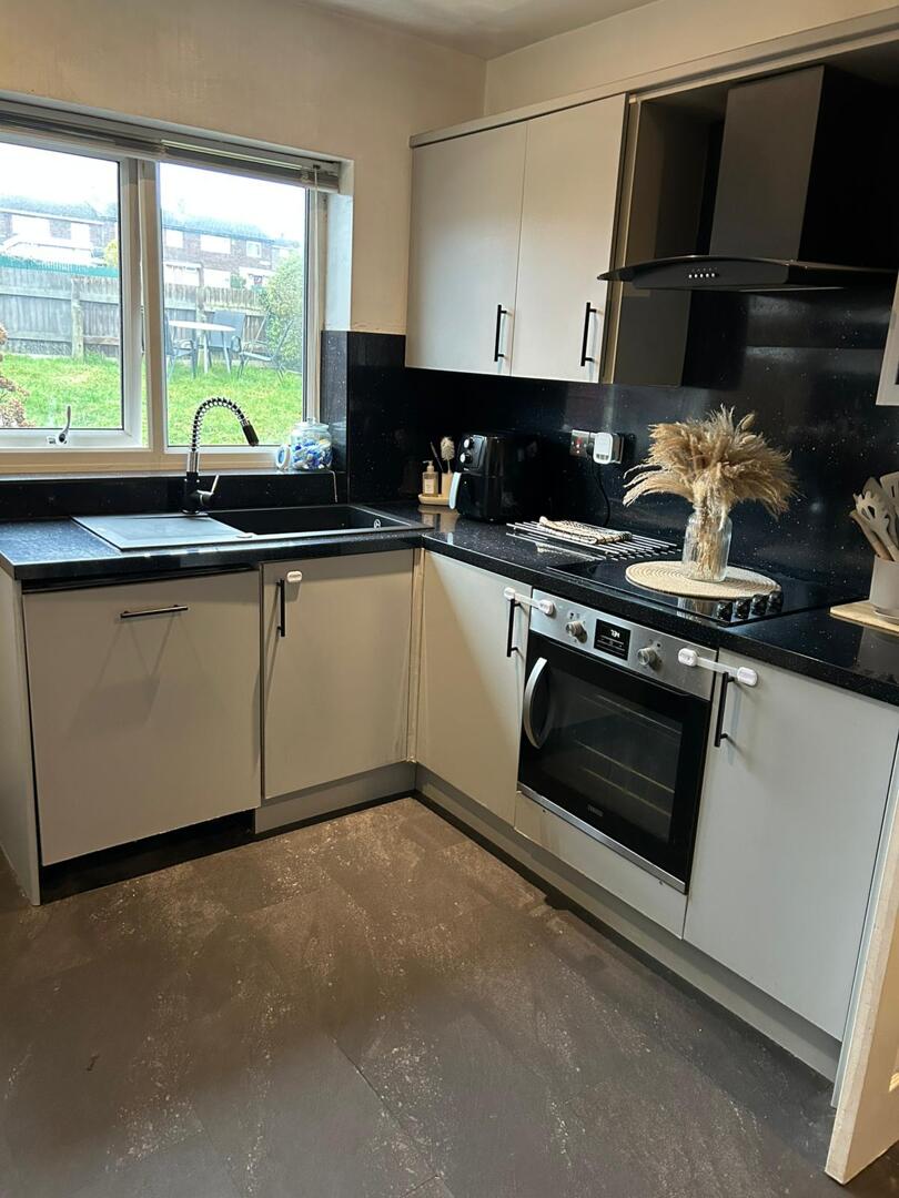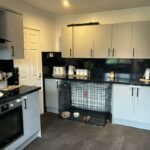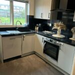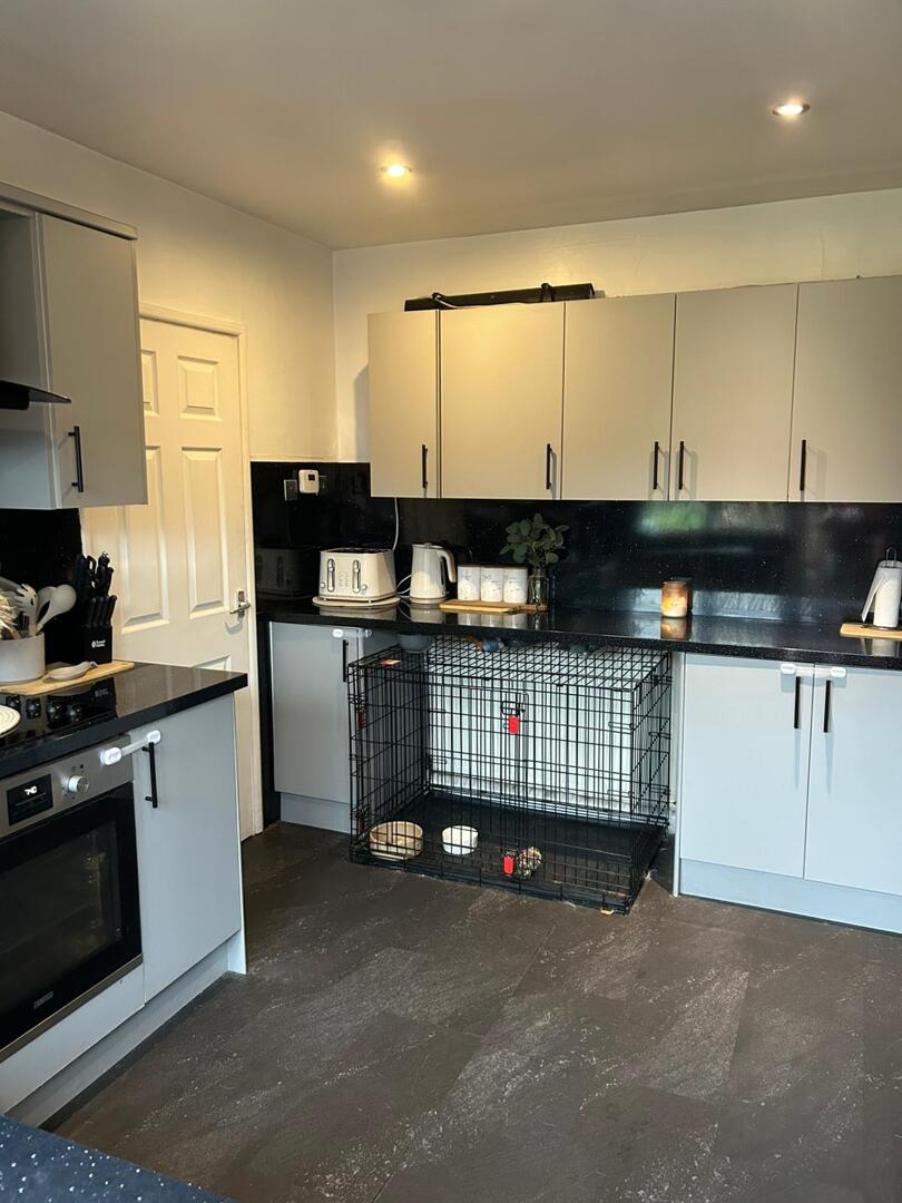 Modern kitchen fitted with a range of grey high gloss units to both high and low levels. Complimentary worktop with splashback and inset sink, drainer and mixer tap. Four ring electric hob with electric oven below and extractor hood above. Plumbing for automatic washing machine and space for under counter fridge and freeze. Door leading to rear garden and door to pantry storage. Upvc double glazed window overlooking rear.