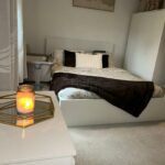 Modern white suite comprising low flush w.c, wash hand basin with chrome mixer tap set into storage unit. White paneled bath with shower over. Fully tiled walls. Modern central heating towel radiator and Upvc, frosted double glazed window to the rear.