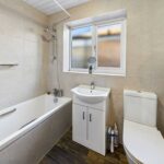 Modern three piece suite comprising of a low level W/C. Handwash basin mounted over vanity unit and bath with tiled panel and shower over. Tiled walls throughout and UPVC double glazed opaque window to side aspect. Heated towel rail/radiator. Wood effect tiled flooring.