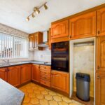 Fitted with a range of matching high and low level storage units complemented by granite-effect work surfaces. Tiling to splashback areas. Stainless steel sink with drainer and mixer tap. Hotpoint four-ring hob with extractor hood above and built-in Bosch oven and grill. Space and plumbing for a fridge freezer and washing machine, with additional provision for a dryer or dishwasher. Tiled flooring throughout. UPVC double-glazed window to the front aspect.