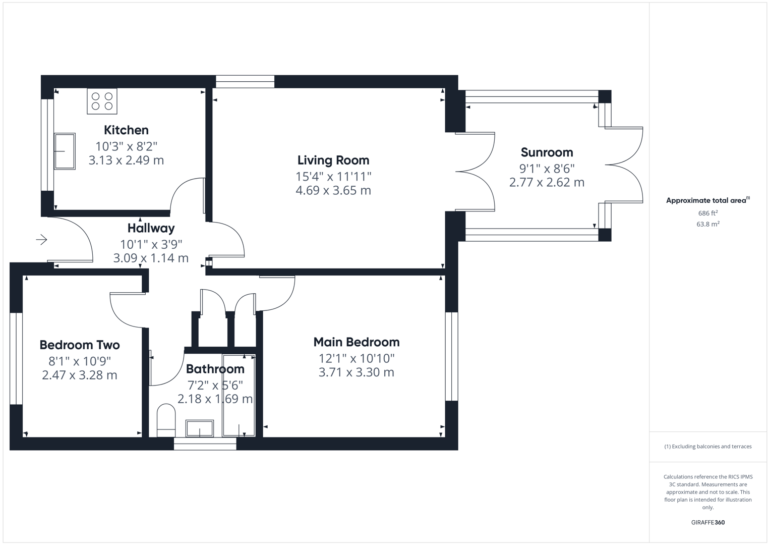 The accommodation briefly comprises: an entrance hall, a generous lounge with feature fireplace and French doors opening into a sunroom, providing a pleasant outlook over the rear garden. The fitted kitchen includes a range of wall and base units, while two well-sized double bedrooms and a recently modernised family bathroom with bath, overhead shower, wash basin, and WC complete the internal layout.