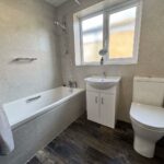 Modern three piece suite comprising of a low level W/C. Handwash basin mounted over vanity unit and bath with tiled panel and shower over. Tiled walls throughout and UPVC double glazed opaque window to side aspect. Heated towel rail/radiator. Wood effect tiled flooring.