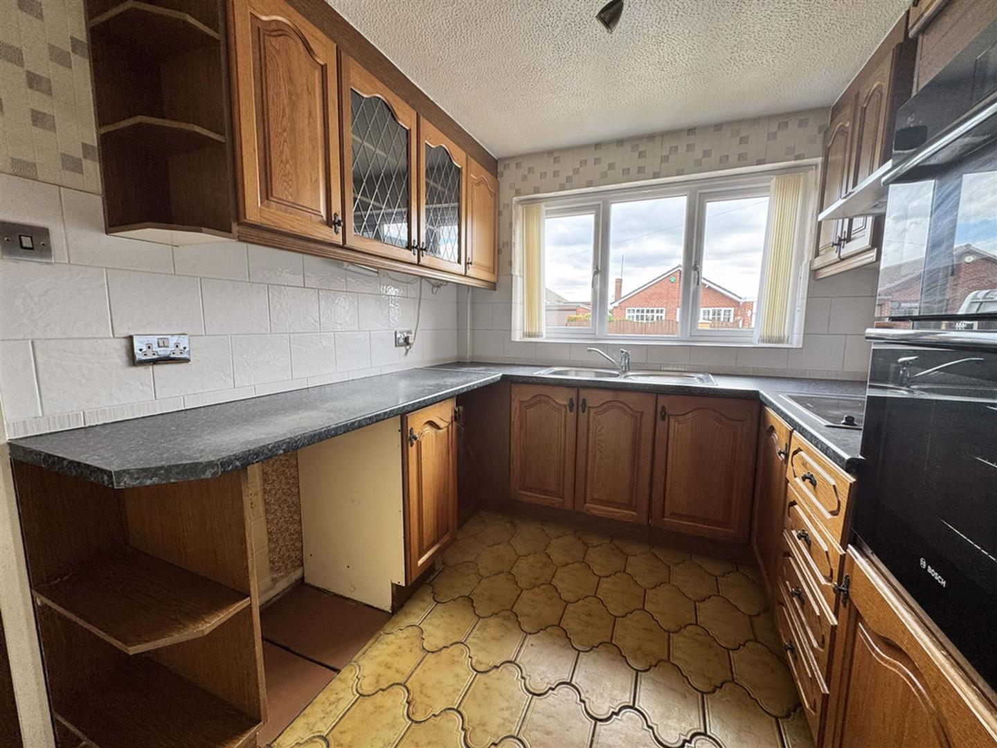 Matching high and low level storage units with granite effect work surfaces over. Tiling to splash prone areas. Stainless steel sink with drainer and mixer tap. Hot point four ring hob with extractor fan over. Built in bosh oven and grill. Space for fridge freezer, space plumbing for washing machine and dryer/dishwasher. Tiled flooring throughout. UPVC double glazed window to front aspect.