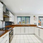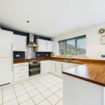 Kitchen area having high and low level storage units with laminate wood affect roll edged work surfaces with matching splashbacks. Inset stainless steel one and a half sink and draining board with chrome mixer tap. Integrated four ring gas hob with extractor fan over and stainless steel splashback and oven/grill beneath. Full size integrated fridge freezer and dishwasher. Tiled flooring, recess spotlights, UPVC double glazed window to rear aspect, gas central heated radiator and door through to utility room.