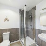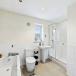 Three piece suite comprising of a low level W/C, pedestal handwash basin with chrome mixer tap and a walk in mains fed thermostatic controlled shower. Tiled walls to splash prone areas, gas central heated radiator, recess spotlights and UPVC double glazed opaque window to front aspect.