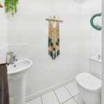 Two piece suite comprising of a low level W/C, pedestal handwash basin with chrome mixer tap and tiled splashback. Tiled flooring and gas central heated radiator.