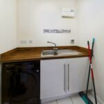 Low level storage units with laminate wood affect roll edged work surfaces with matching splashbacks. Inset stainless steel sink with draining board and chrome mixer tap. Space and plumbing for washing machine, tiled flooring and gas central heated radiator.