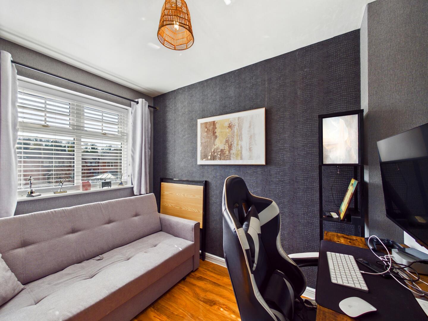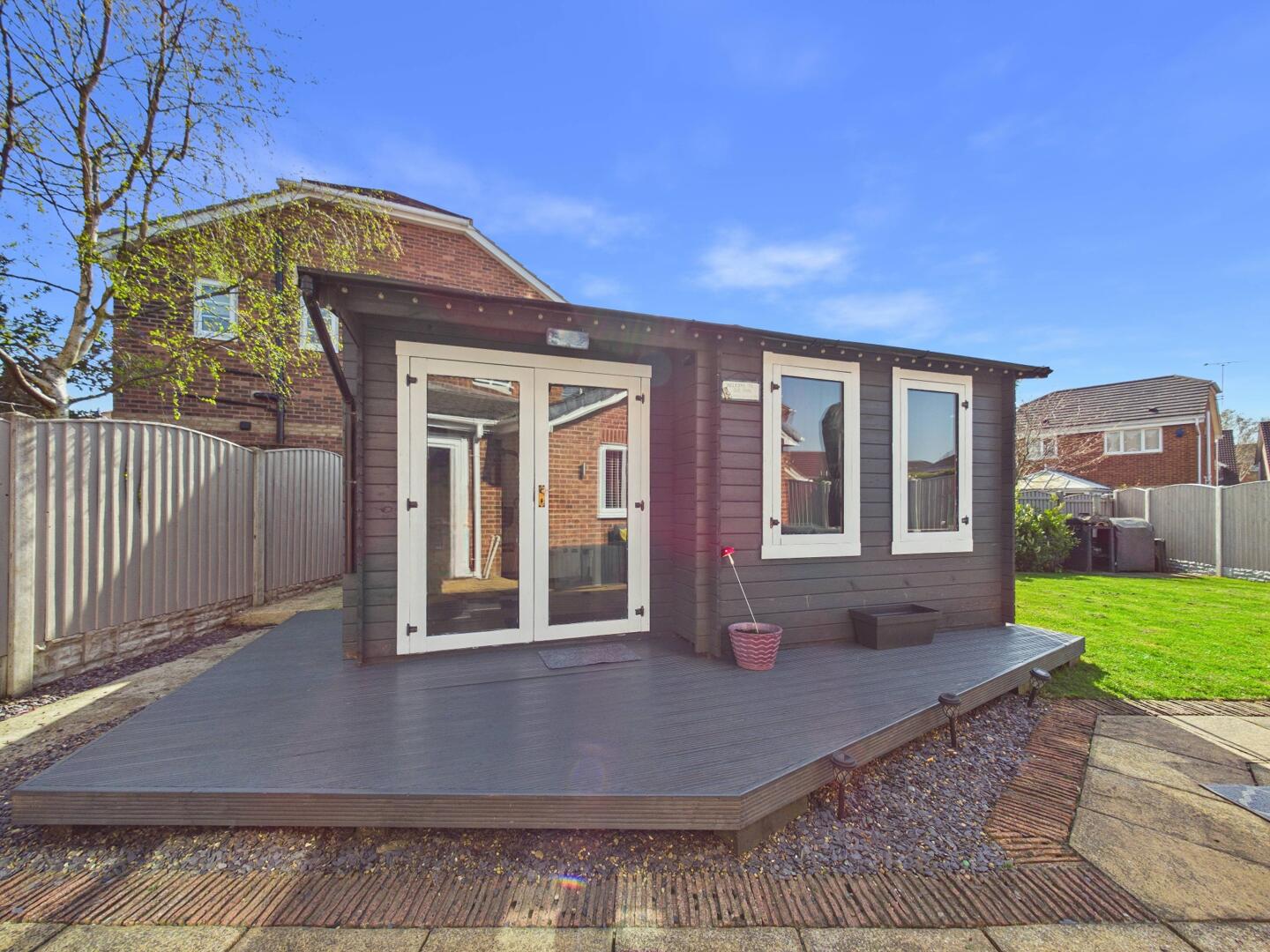 To the rear, the property boasts a beautifully presented and generously sized garden, perfect for both relaxing and entertaining. A well-maintained lawn is complemented by a stylish patio seating area, ideal for outdoor dining. A standout feature is the summer house, complete with decking, offering a versatile space suitable for use as a home office, gym, or leisure area. The garden is fully enclosed with fencing, providing a safe and private environment for families and pets, while also enjoying plenty of natural sunlight throughout the day.