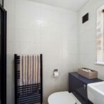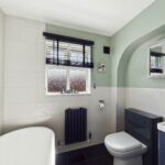 WC with low level flush. Wash hand basin with chrome mixer tap. Extractor fan. Central heated towel rail.