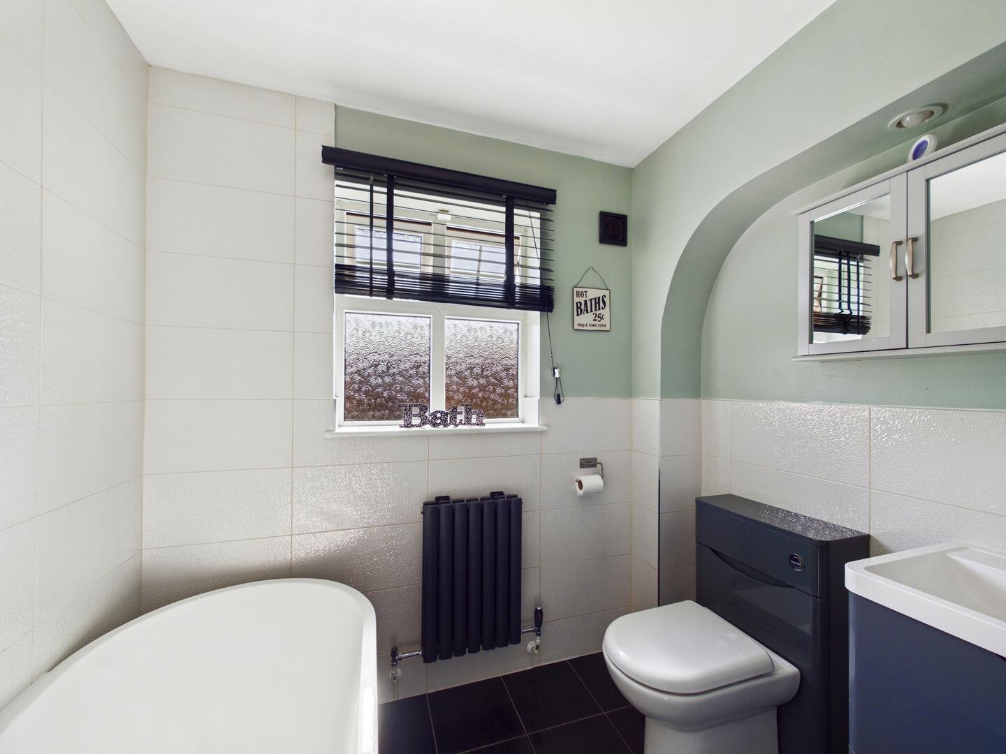 White suite comprising of panel bath and chrome taps. WC with low level flush. Wash hand basin with chrome mixer tap. Bluetooth ceiling speaker. Extractor fan. Tiled effect flooring. Central heated radiator. UPVC double glazed frosted window to the rear aspect.