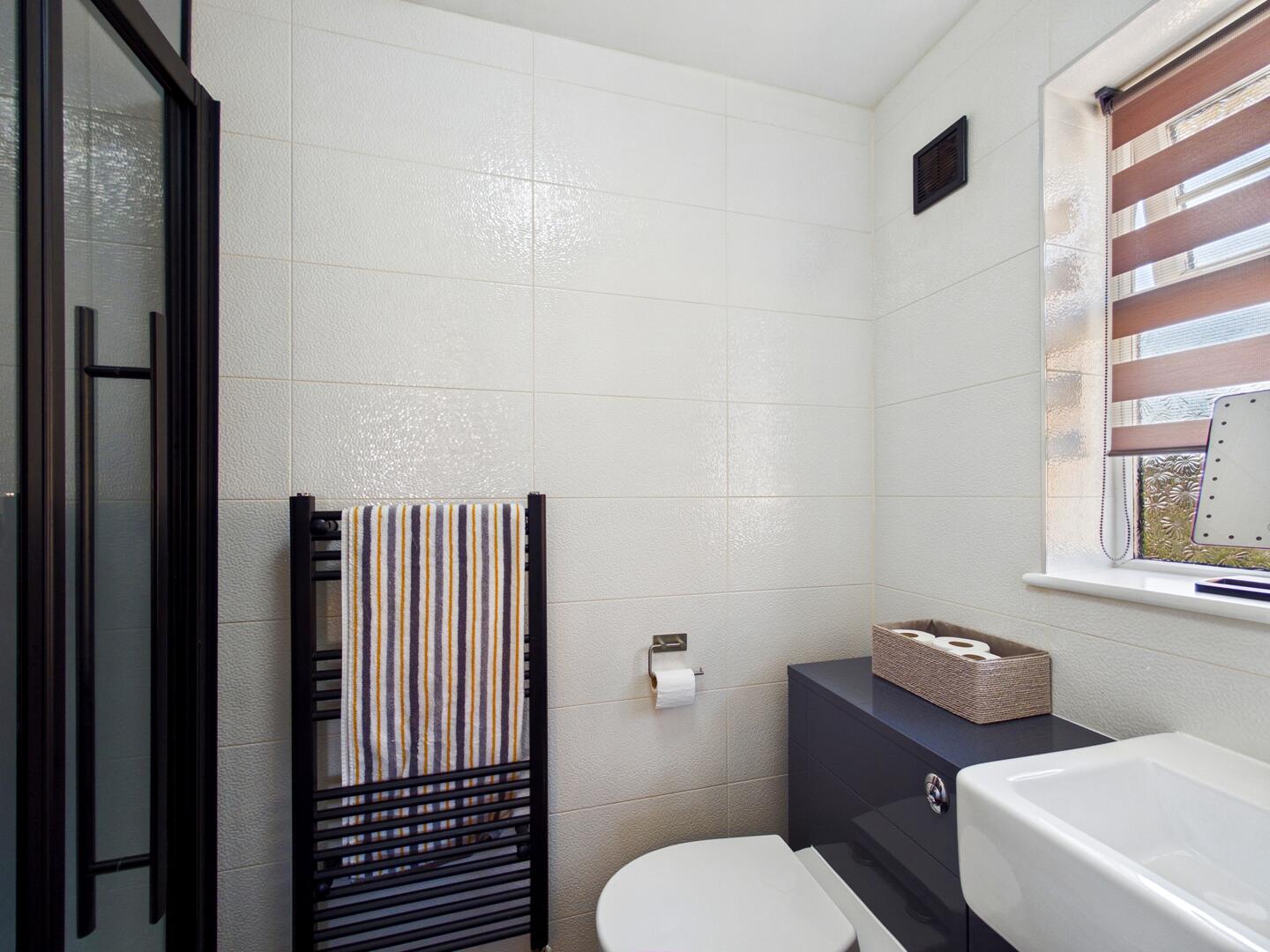 Shower cubicle with mains feed shower. Extractor fan. Central heated towel rail. UPVC double glazed frosted window to the side elevation.