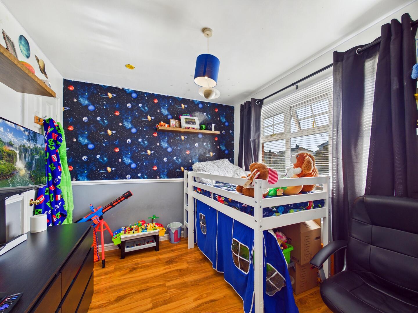 Built in wardrobes and storage cupboards. Access to en suite. Wood effect flooring. Central heated radiator. UPVC double glazed bay window to the front elevation.