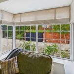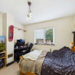 Bedroom Three is a more compact double room with soft carpeting and light, neutral walls. A window overlooks the garden, and the room benefits from natural light and a cosy feel.