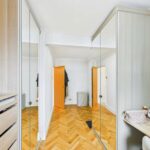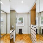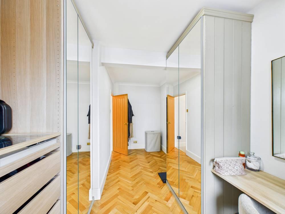 Bedroom Four, also designated as a dressing room, provides a versatile space with solid oak parquet flooring and neutral walls. Fitted wardrobes line one side, with mirrored doors enhancing the light and space within the room.
