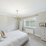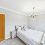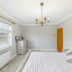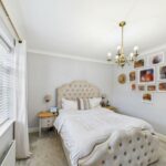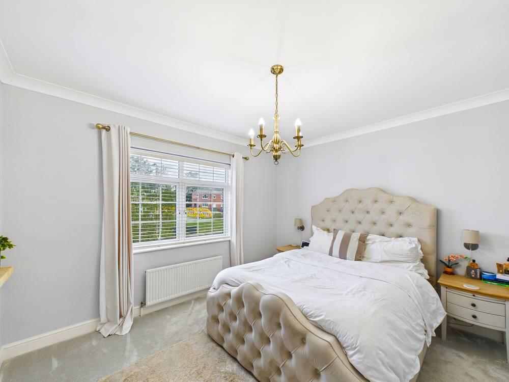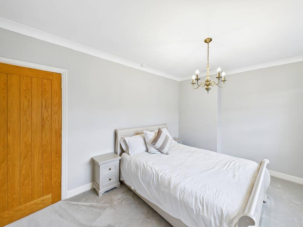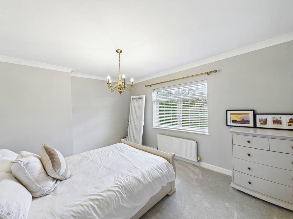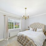 The main bedroom is a comfortable double room, softly carpeted and decorated in calm neutral tones with white walls and an elegant chandelier. It benefits from a large window providing ample natural light.