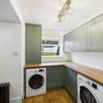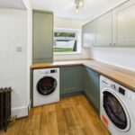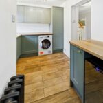 The utility room offers practical space with fitted storage cupboards painted in a muted green shade, wooden worktops, and plumbing for a washer and dryer. Natural light comes through a window and the flooring here is a warm, wood affect porcelain tiles , complementing the kitchen area nearby.