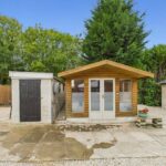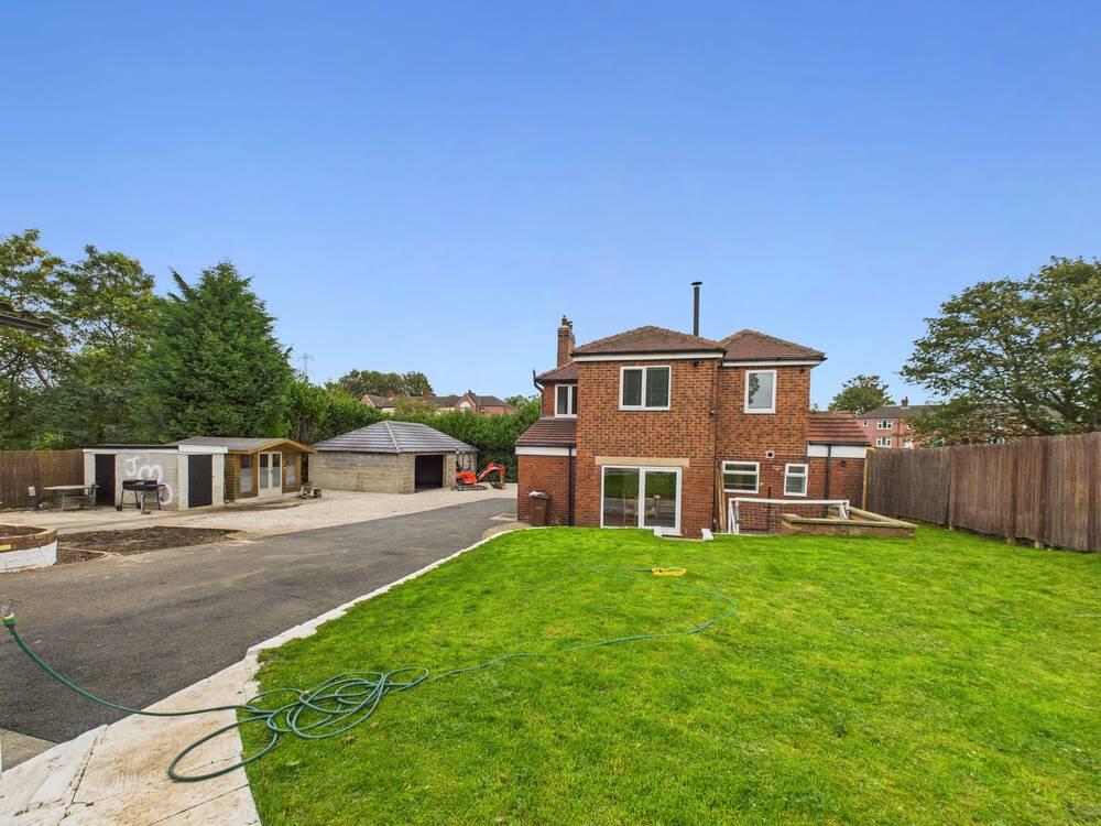 The rear garden offers a large lawn area bordered by fencing, with paved patios ideal for outdoor furniture and entertaining. Several outbuildings, including a garden shed and a spacious workshop, are neatly positioned around the garden, lending versatility beyond the main house. Mature trees and well-maintained greenery add privacy and a natural touch to the outdoor space.