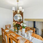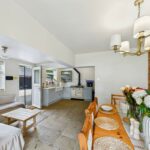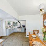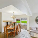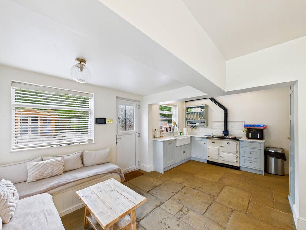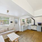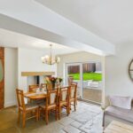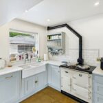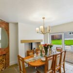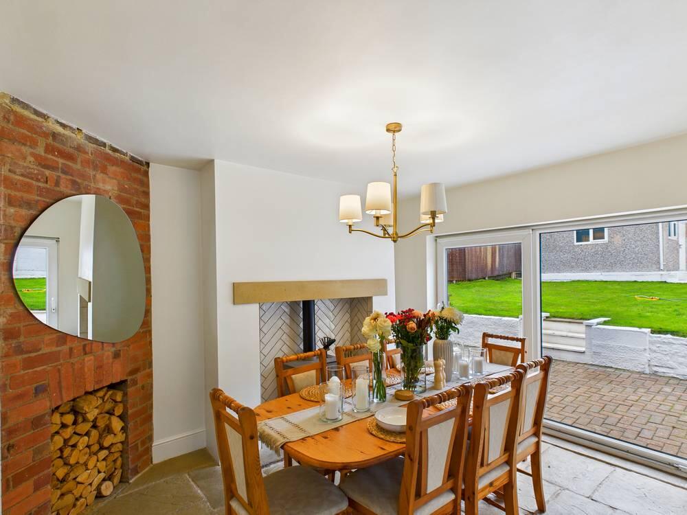 The kitchen and living area form a spacious and practical open-plan space. The kitchen is fitted with light blue cabinetry and includes an AGA cooker as a focal point beneath a white ceiling. There is a built-in seating area adjacent to the kitchen, and the stone-tiled floor extends throughout the space, creating a cohesive look. French doors open onto the patio and garden beyond, filling the room with natural light and providing easy outdoor access. The dining room features a charming blend of traditional and contemporary styles, with a wood-burning stove nestled within a brick fireplace adds warmth and character, while large sliding doors open directly onto the patio, flooding the space with natural light and providing easy access to the garden.
