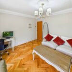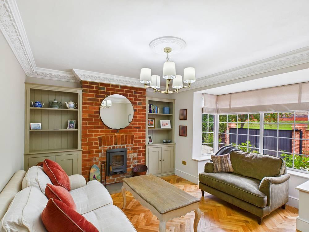 The first living room is a bright and comfortable space featuring a bay window, a wood-burning stove set into an exposed brick fireplace, and solid oak parquet flooring . The room is tastefully decorated with light walls and classic moulded ceilings.