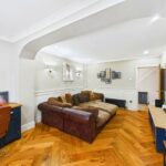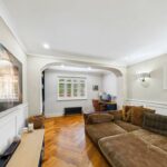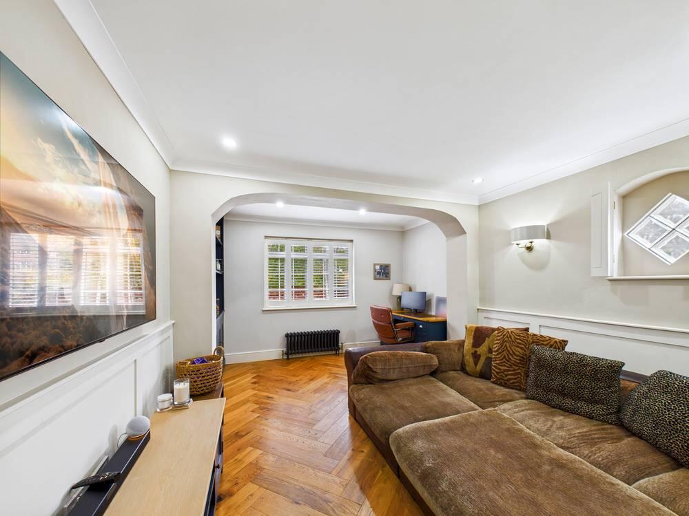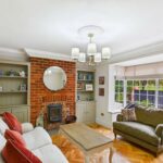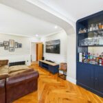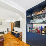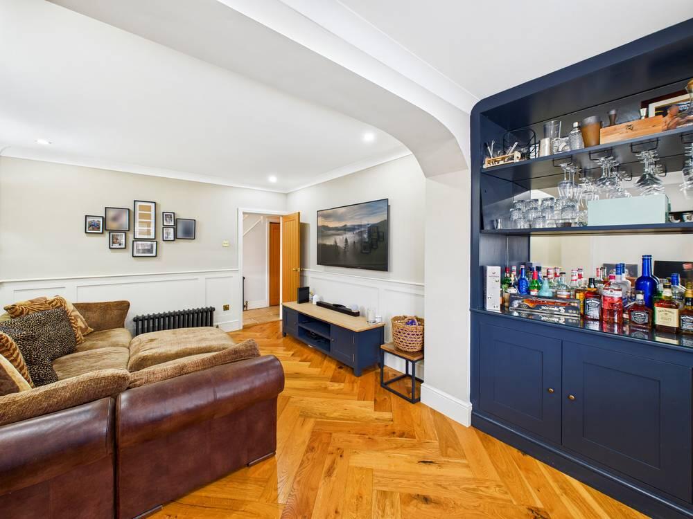An inviting second living room with ample space for seating is enhanced by solid oak parquet flooring and painted white walls. It benefits from a stylish built-in drinks cabinet painted in deep navy, fitted with glass shelves and lighting, adding a refined touch to the room.