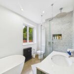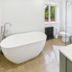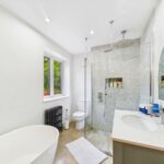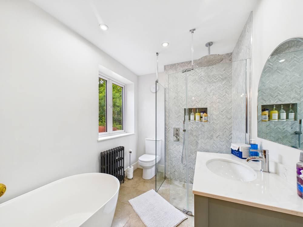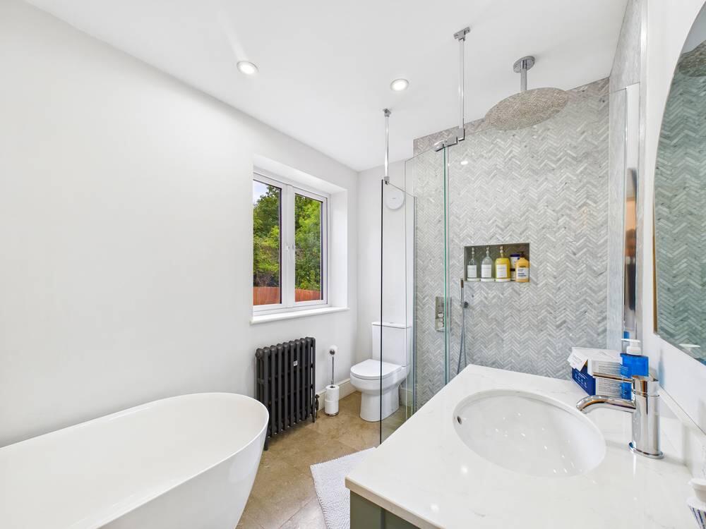 The bathroom is a bright, modern space with neutral tones throughout. It features a free-standing bathtub, a walk-in shower with a stylish herringbone tiled wall, a sleek white vanity unit with storage, and a toilet. A window allows natural light to flood the room, creating a fresh and airy atmosphere.