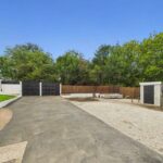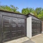 This property enjoys a sweeping driveway leading to multiple garages and outbuildings, providing ample parking and storage.