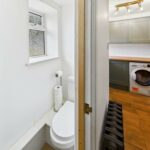 The WC is a compact but well-appointed space, featuring white walls and a simple toilet suite. A small window provides natural light and ventilation, complementing the neat layout.