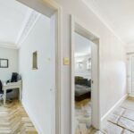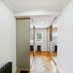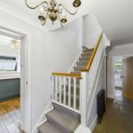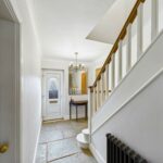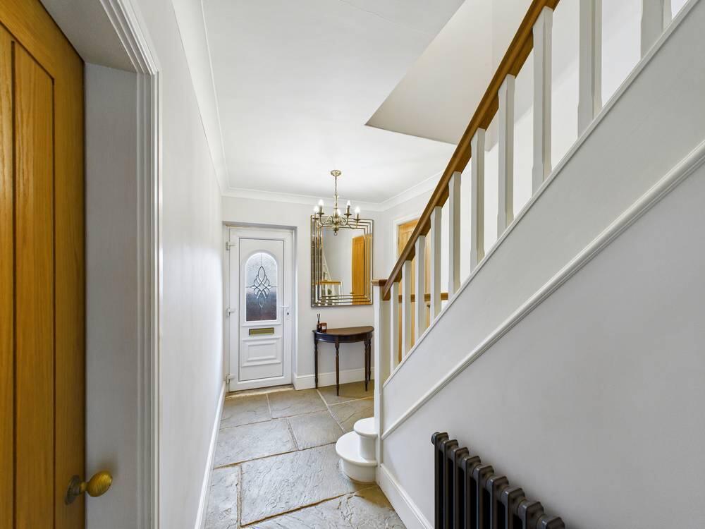 This welcoming hallway is laid with natural stone flooring and framed by white walls. It features a stylish black radiator, a wooden staircase with storage below, white banisters, and a classic chandelier, creating an inviting first impression that offers access to various rooms on the ground floor.