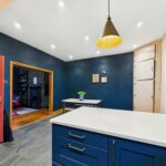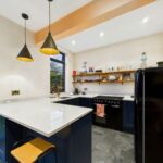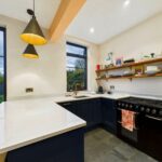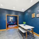 Modern range of low level base units with quartz work tops. Integrated appliances include Bosch washing machine and Bosch dishwasher. Double Smeg cooker with hob and Smeg fridge/freezer. Composite under mounted sink with gold stainless steel tap. Breakfast bar. Double glazed UPVC window looking to the rear of the property. Tiled flooring throughout. French doors opening to the rear garden.