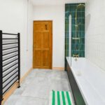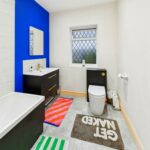 Modern white suite comprising of panel bath with shower screen and gold stainless steel taps with shower above and fancy tiled splashback. Wall mounted wash hand basin with gold mixer tap set in vanity unit and tiled splashback. WC with wall mounted flush. Contemporary central heated towel rail. Tiled flooring throughout. UPVC double glazed frosted window looking to the rear.