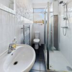 White suite comprising of mains feed shower with double enclosure. WC with low level flush. Wash hand basin with chrome mixer tap. Central heated chrome towel rail. Tiled walls. Tiled flooring. Double glazed UPVC frosted window looking to the rear.