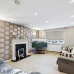 A fireplace with a gas fire and hearth and surround feature wall lighting. UPVC double glazed window to the rear elevation with a gas central heated radiator below . Spotlights to the the ceiling.