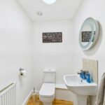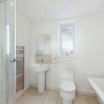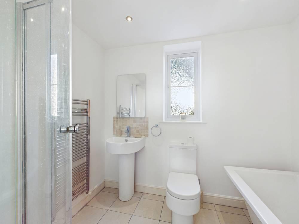 Suite comprising of a freestanding bath tub with chrome mixer tap, hand wash basin with a chrome mixer tap, a low-level flush wc and a corner walk-in shower cubicle with a mains feed chrome shower and controls. Chrome heated towel radiator. Part tiling to the walls and tiling to the floor. To the ceiling there are spotlights and an extractor fan. UPVC double glazed window to the rear elevation.