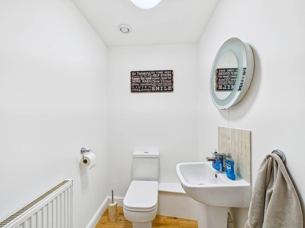 With a low level flush w/c, sink with a chrome mixer tap, extractor fan to the ceiling, engineered wood flooring and a gas central heated radiator .