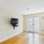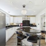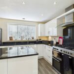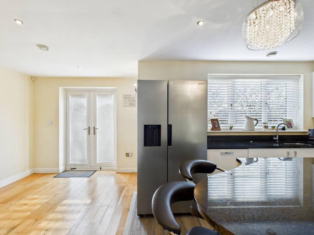 The kitchen comprises of a range of wall and base kitchen units in high gloss effect with a matching breakfast island. The island and work surfaces are granite. The sink is under mounted with a chrome mixer tap over and the drainer is embedded into the granite worksurface. There is a freestanding gas and electric range style cooker with stainless steel extractor hood above. The integrated appliances include a dishwasher and wine fridge. There is a gas central heated radiator. The under stairs storage cupboard part of the room has engineered wood flooring while the rest of the kitchen has complementary wood laminate effect flooring . There is space for a double American fridge freezer and access into a utility room. Spotlights and extractor fan to the ceiling. Double glazed window to the rear elevation and French Doors leading to the rear garden.