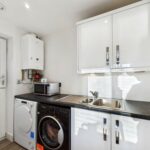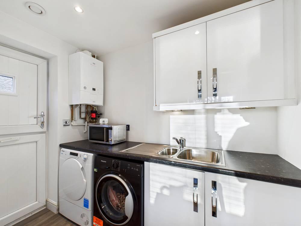 There is a wall mounted Combi boiler, plumbing for washing machine and dryer. Kitchen cabinet tray to wall and base level levels and an integrated stainless steel sink drainer and chrome mixer tap. There are spotlights to the ceiling. A stable door which is located at the side elevation giving access to the side garden.