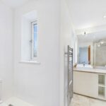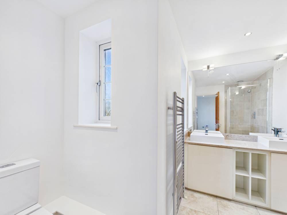 A suite comprising of a double walk-in shower cubicle and complimentary tiling to the walls, low-level flush w/c and twin his and her sinks with chrome mixer taps and storage underneath. A full length and width wall mounted mirror with feature lighting above. Shaving sockets, a chrome heater towel radiator and tiling to the floor. UPVC double glazed window.