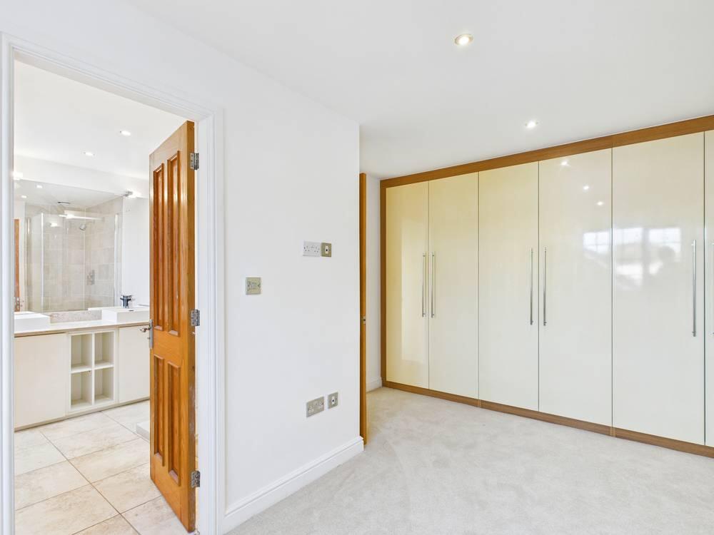 A range of full height fitted wardrobes running the full length of the wall, spotlights to the ceiling, TV sockets, a gas central heated radiator and double glazed window to the front elevation. Access into the ensuite.