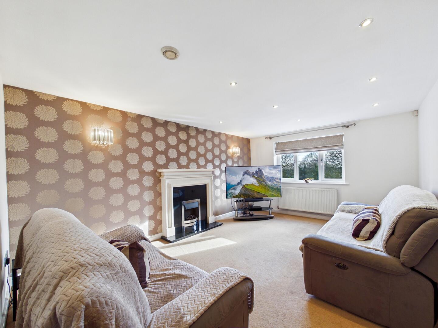 A fireplace with a gas fire and hearth and surround feature wall lighting. UPVC double glazed window to the rear elevation with a gas central heated radiator below . Spotlights to the the ceiling.