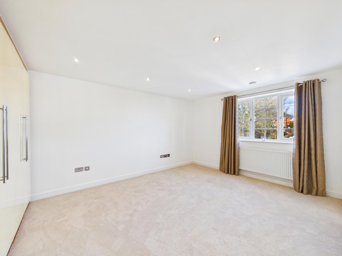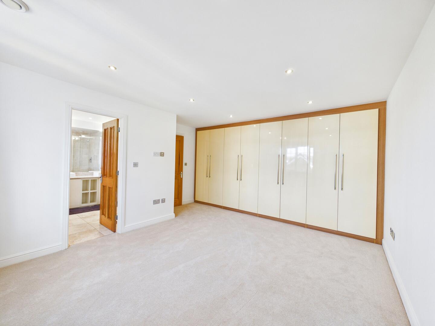 A range of full height fitted wardrobes running the full length of the wall, spotlights to the ceiling, TV sockets, a gas central heated radiator and double glazed window to the front elevation. Access into the ensuite.