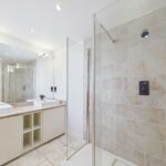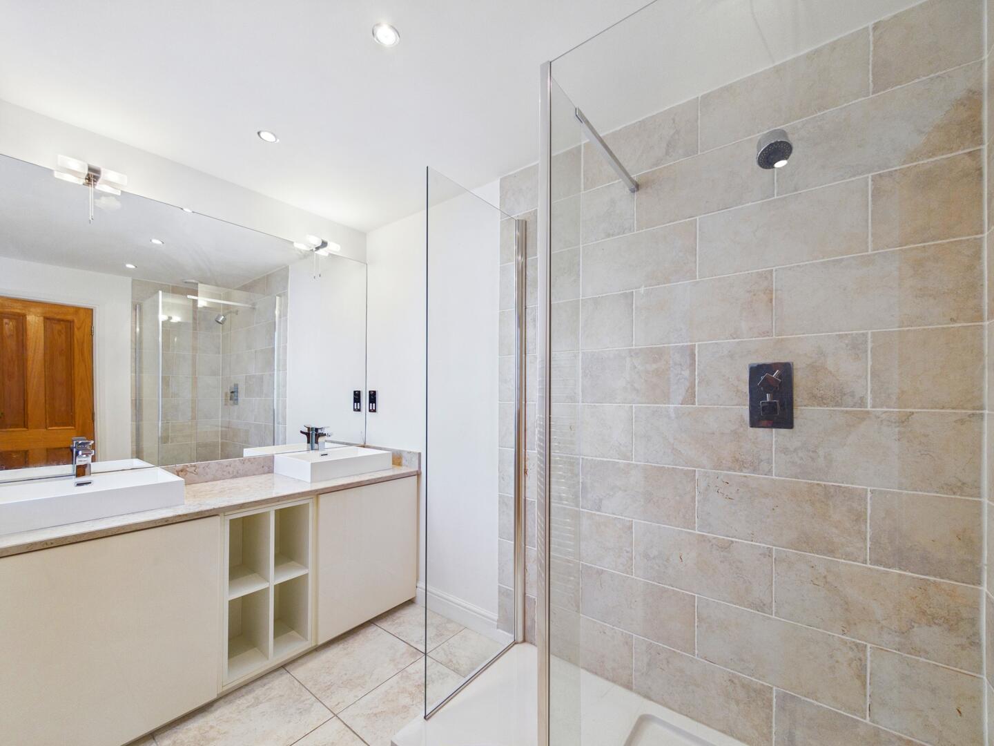 A suite comprising of a double walk-in shower cubicle and complimentary tiling to the walls, low-level flush w/c and twin his and her sinks with chrome mixer taps and storage underneath. A full length and width wall mounted mirror with feature lighting above. Shaving sockets, a chrome heater towel radiator and tiling to the floor. UPVC double glazed window.