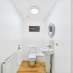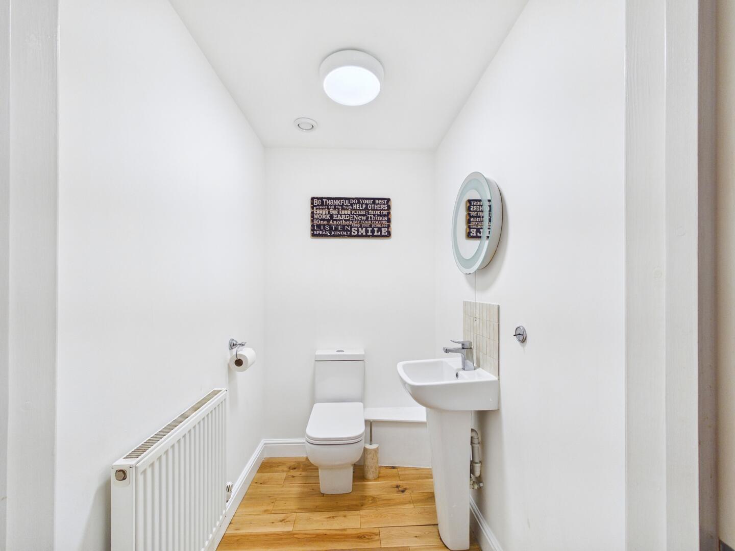 With a low level flush w/c, sink with a chrome mixer tap, extractor fan to the ceiling, engineered wood flooring and a gas central heated radiator .