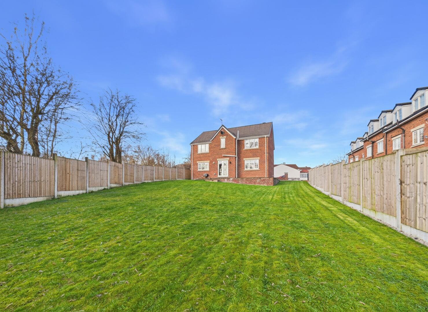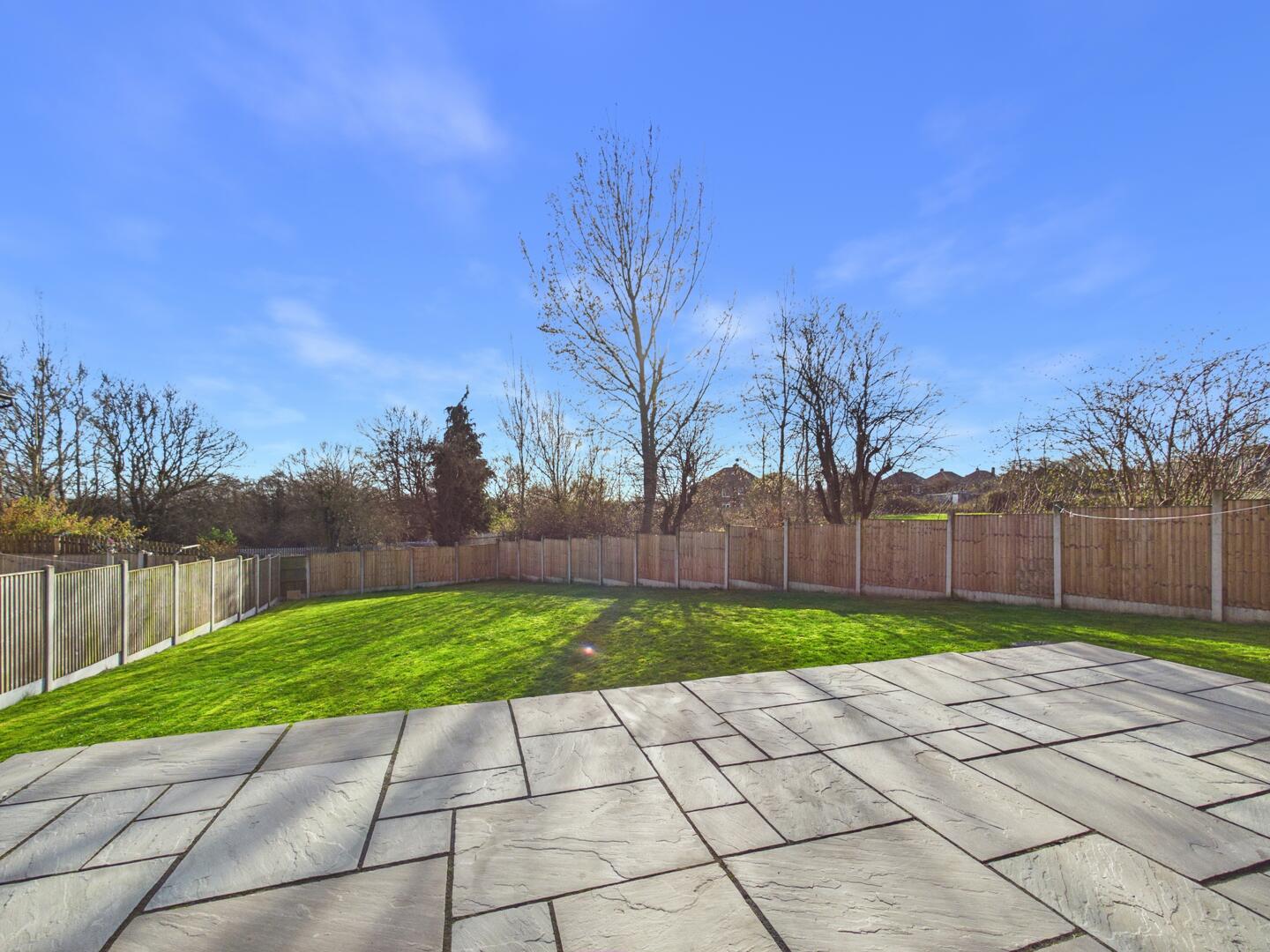 To the rear, there is a lawned garden fenced around, with an Indian Stone patio.
