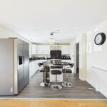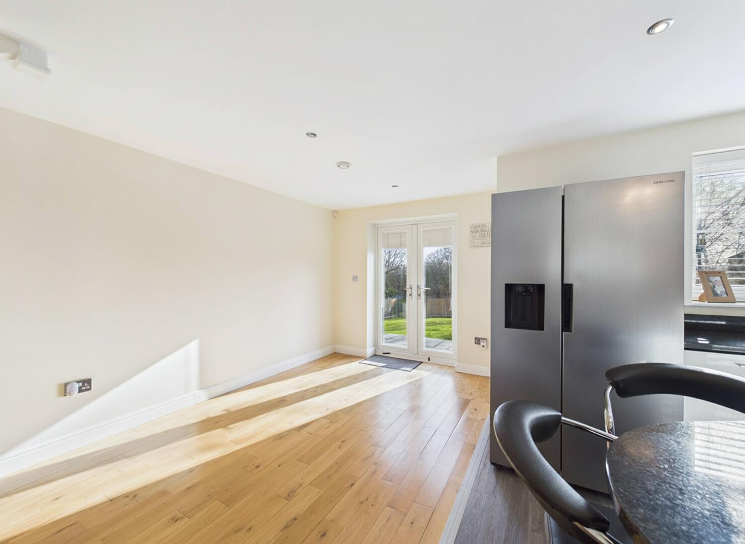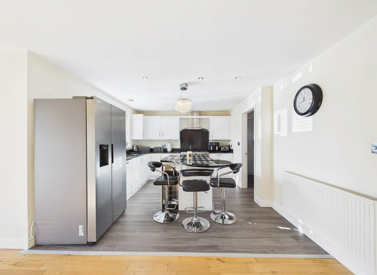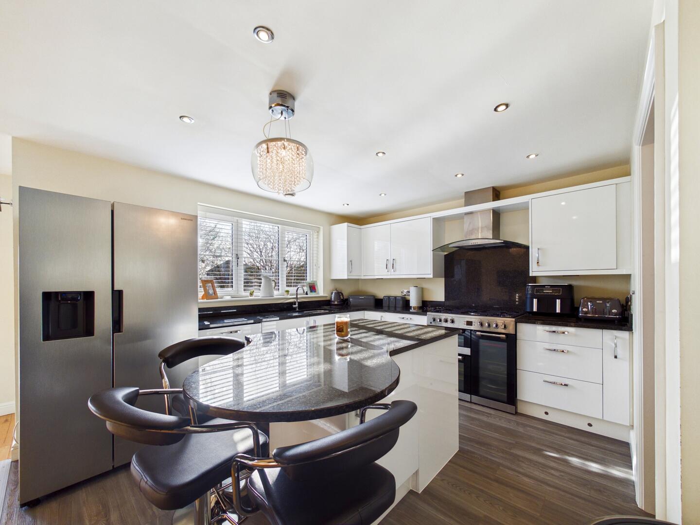 The kitchen comprises of a range of wall and base kitchen units in high gloss effect with a matching breakfast island. The island and work surfaces are granite. The sink is under mounted with a chrome mixer tap over and the drainer is embedded into the granite worksurface. There is a freestanding gas and electric range style cooker with stainless steel extractor hood above. The integrated appliances include a dishwasher and wine fridge. There is a gas central heated radiator. The under stairs storage cupboard part of the room has engineered wood flooring while the rest of the kitchen has complementary wood laminate effect flooring . There is space for a double American fridge freezer and access into a utility room. Spotlights and extractor fan to the ceiling. Double glazed window to the rear elevation and French Doors leading to the rear garden.