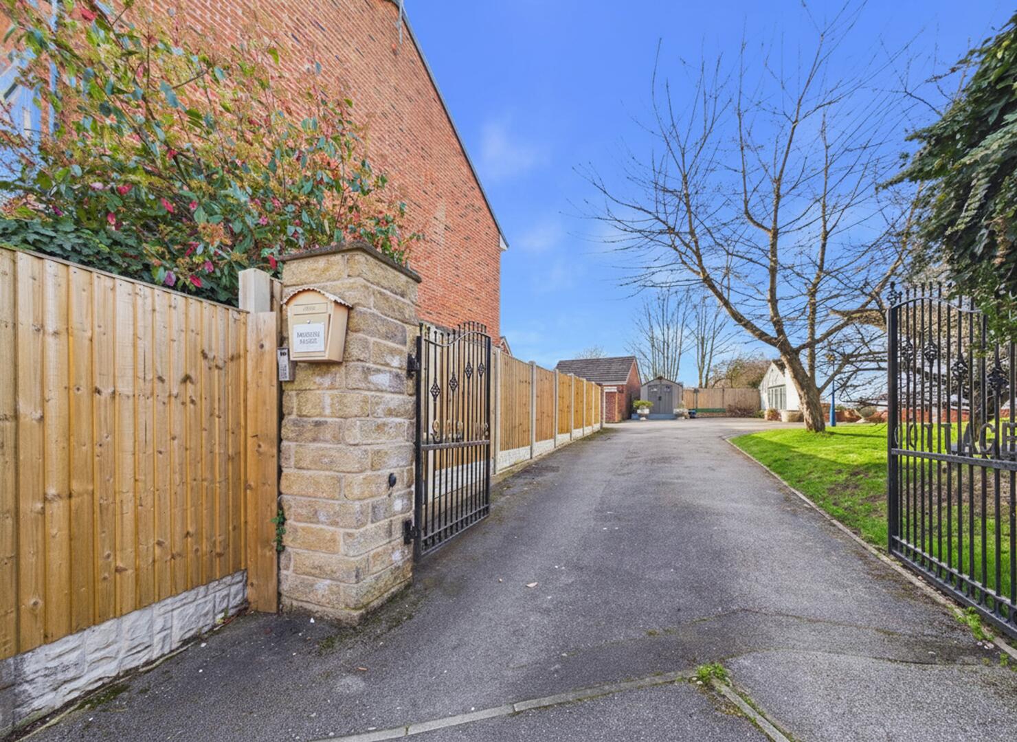 The property is accessed via a private shared driveway of only two properties. The property is separated via iron electric gates. Tarmac driveway. A front garden and ample parking.