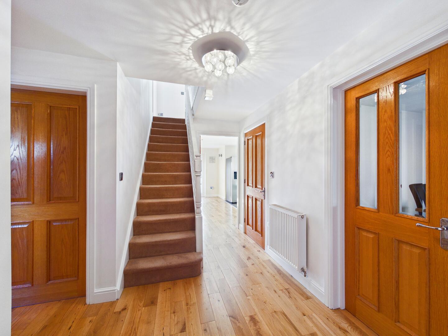 A truly stunning detached four-bedroom family residence, individually designed by the current owner, offering exceptional space, quality and privacy throughout. Finished to an impressive standard, this beautiful home boasts high-quality fixtures and fittings, with bespoke carpentry featuring solid oak flooring and doors, creating a timeless and elegant feel.