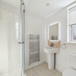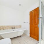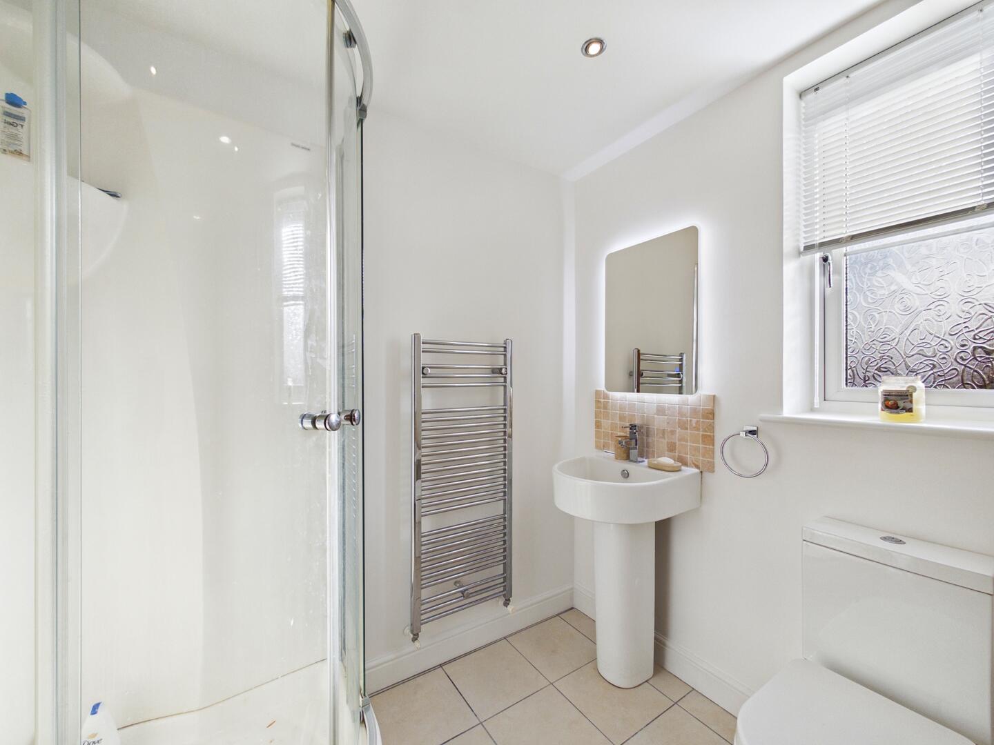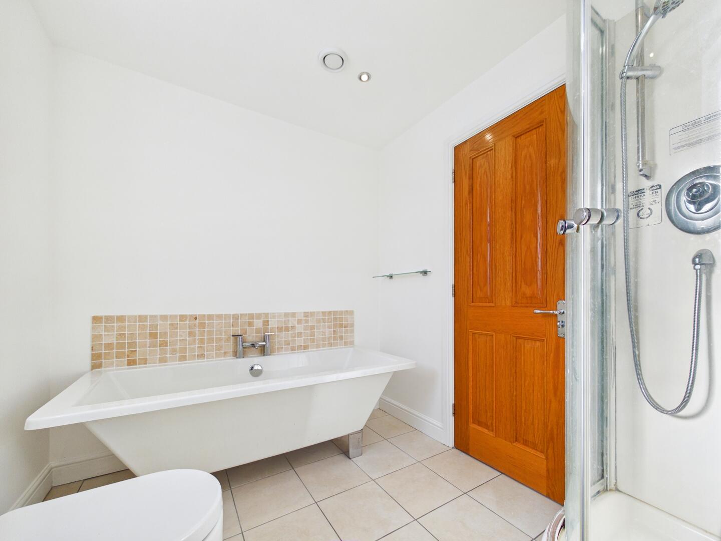 Suite comprising of a freestanding bath tub with chrome mixer tap, hand wash basin with a chrome mixer tap, a low-level flush wc and a corner walk-in shower cubicle with a mains feed chrome shower and controls. Chrome heated towel radiator. Part tiling to the walls and tiling to the floor. To the ceiling there are spotlights and an extractor fan. UPVC double glazed window to the rear elevation.