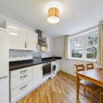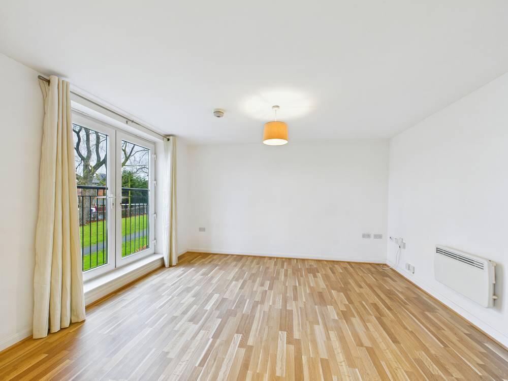 Range of high and low level white gloss kitchen units with laminate effect worktops. Integrated appliances including electric oven, electric hob and extractor hood over. Washing machine. Fridge/freezer. Stainless steel sink with chrome taps over. Double French doors opening to the Juliette balcony. Wood effect flooring. Wall mounted electric heater. UPVC double glazed window to the side elevation.